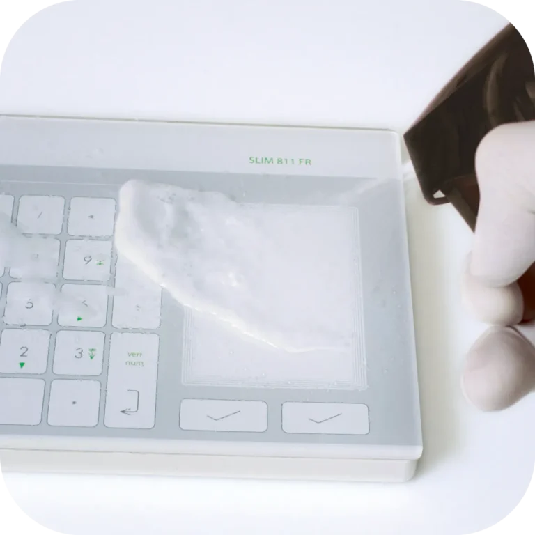 Les claviers en silicone sont difficiles à nettoyer. Les touches surélevées empêchent l’élimination satisfaisante des bactéries. Comparé au silicone, le verre est la meilleure solution pour la décontamination en raison de sa surface extrêmement lisse.